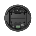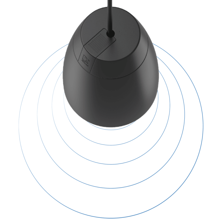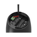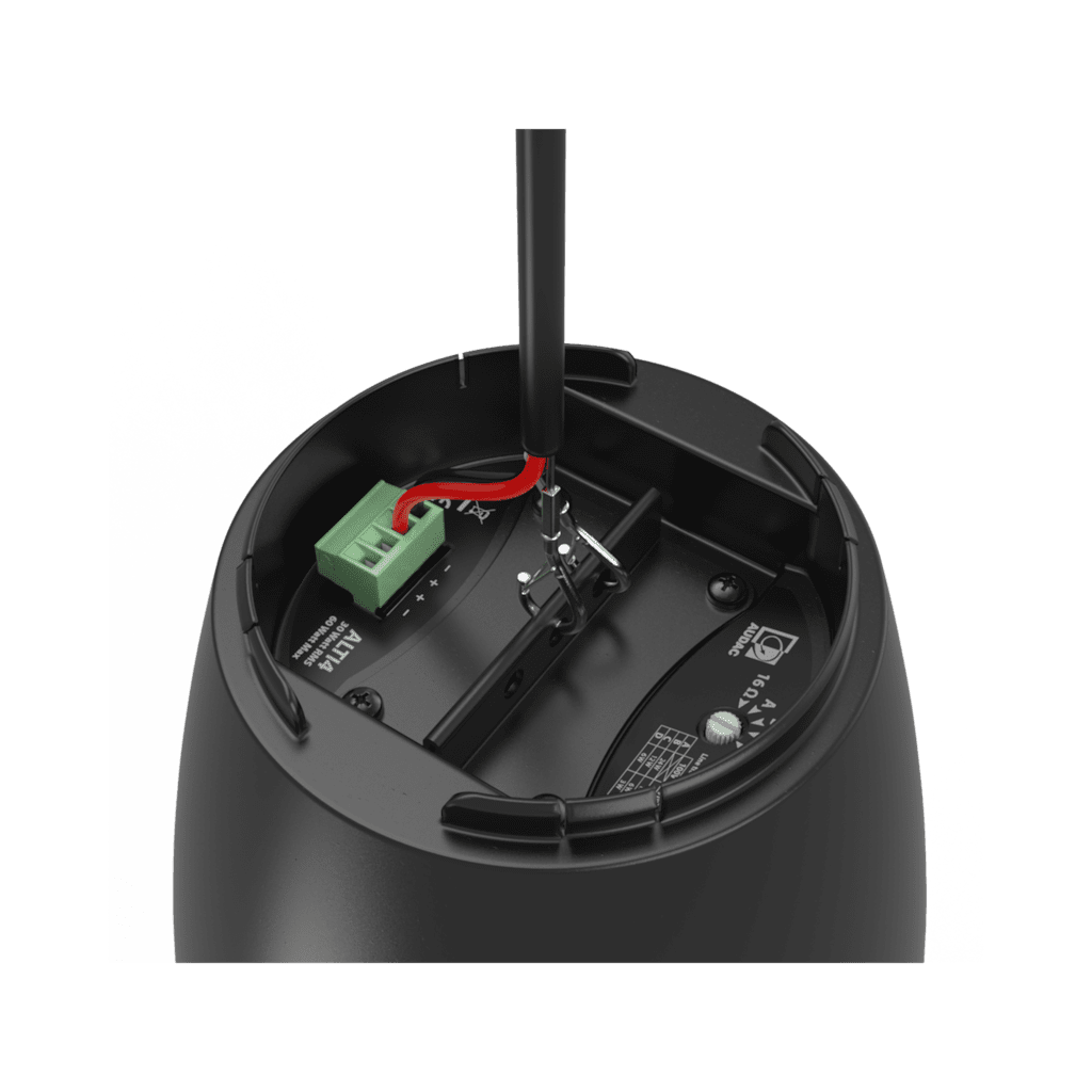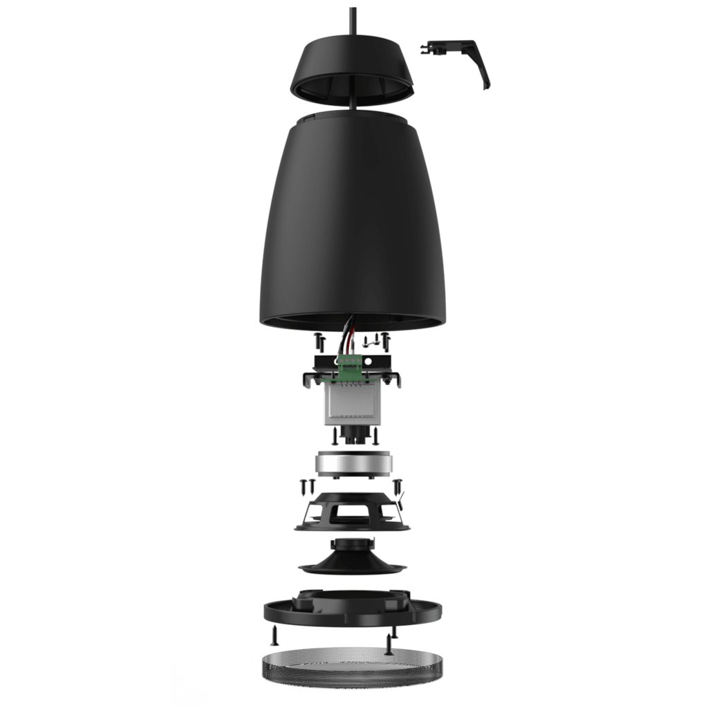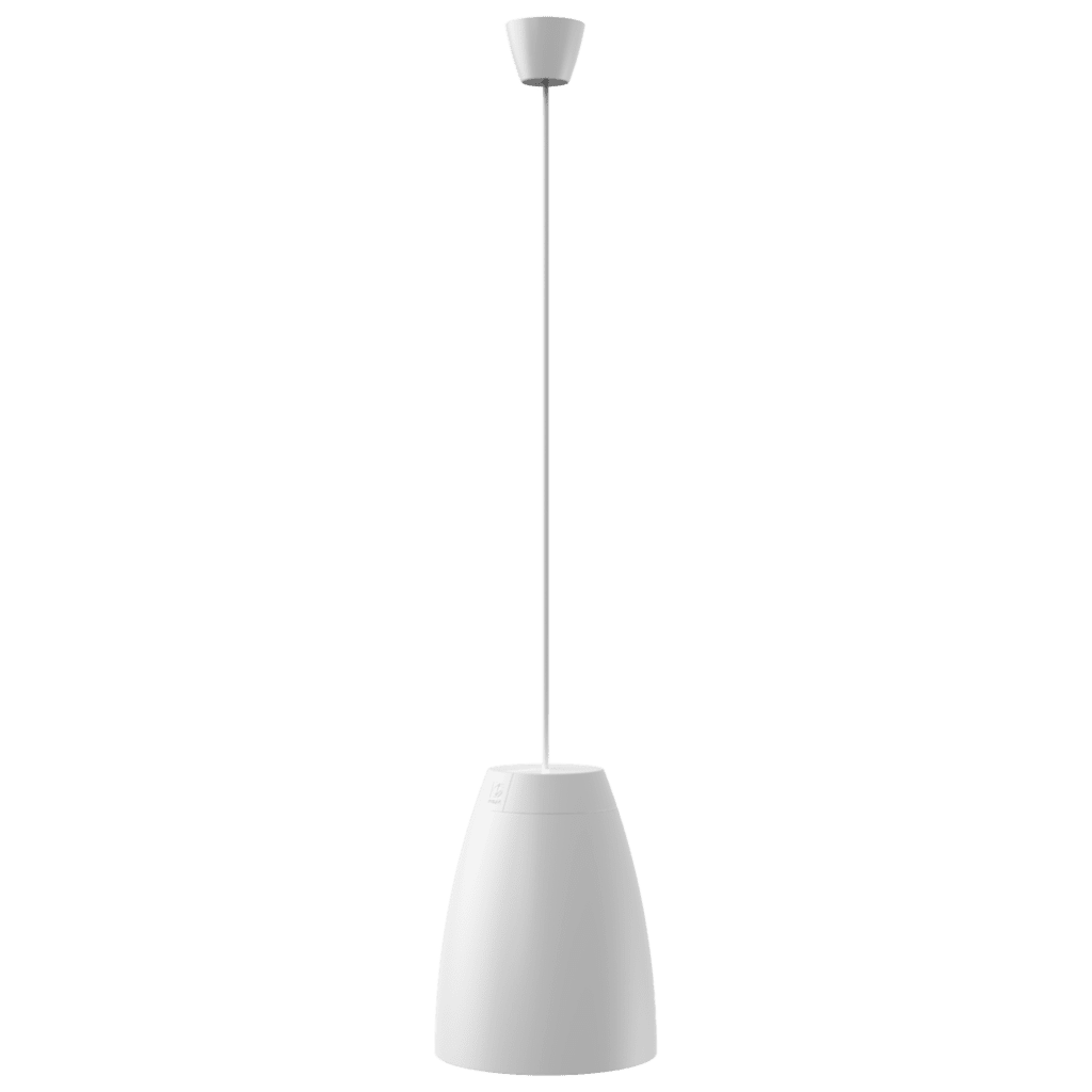 Mounting the speaker is done through a connection cable with two integrated steel cores for suspending with an additional drop safety. Fixation is made through two snap-hooks on one end and a dual Gripple™ fixation on the other end. The included cable length of 3.5 meters offers possibilities for a wide variety of ceiling heights. An innovatively designed rear cover of the speaker can be placed after installation and hides the connection and suspension on the speaker end. The ceiling end connections are covered through a cable cover.