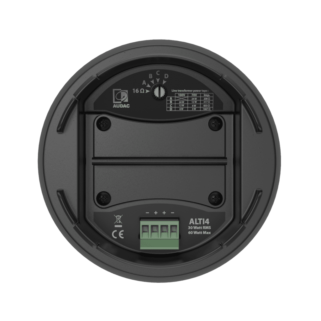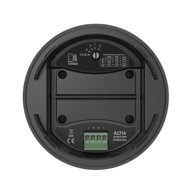 The 2-way combination with a high-quality polypropylene enclosure and acoustic engineering craftsmanship guarantees premium performance for demanding applications. A continuous power handling of 60 Watt (RMS) and maximum power handling of 120 Watt is achieved. Connections are made through a terminal block connector behind the rear cover, accompanied with a power tap selector switch for the tapping of a 70V/100V line transformer with tappings for 60W, 30W, 15W and a 16 Ohm bypass connection.