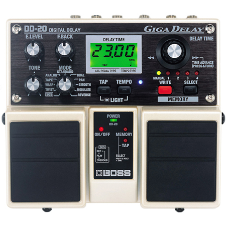 The BOSS DD-20 Digital Delay offers more User memory and long delay time up to 23 seconds. Delay time can be quickly set using the push-button knob or via tap tempo. And with a choice of 11 modes—including new “Smooth” and “Twist” delays and sound-on-sound recording—this Twin Pedal raises the bar for delay effects.
