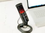 - Two-state LED indicator ring lights blue when mic is powered on and lights red when it is muted
